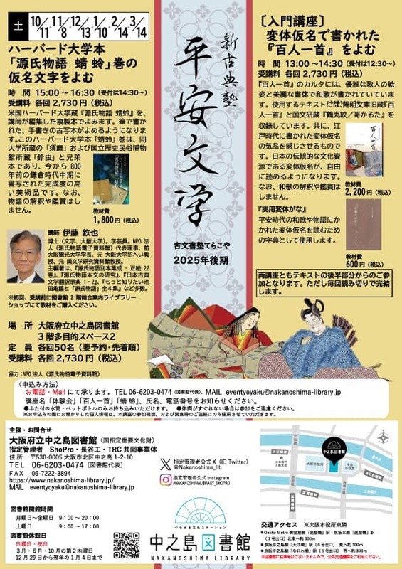 『百人一首』のカルタには、優雅な歌人の絵姿と美麗な書体で和歌が書かれています。使用するテキストには、陽明文庫旧蔵『百人一首』と国文研蔵『鶴丸紋/哥かるた』を収録しています。共に、江戸時代に書かれた変体仮名の気品を感じさせるものです。日本の伝統的な文化資源である変体仮名が、自由に読めるようになります。なお、和歌の解釈や鑑賞はしません。教材費: 2,200円(税込)。『実用変体がな』平安時代の和歌や物語にかかれた変体仮名を読むための字典として使用します。古文書塾てらこや教材費: 600円(税込)。両講座ともテキストの後半部分からのご参加となります。ただし毎回読み切りで完結します。定員: 各回50名(要予約・先着順)。受講料: 各回 2,730円 (税込)。