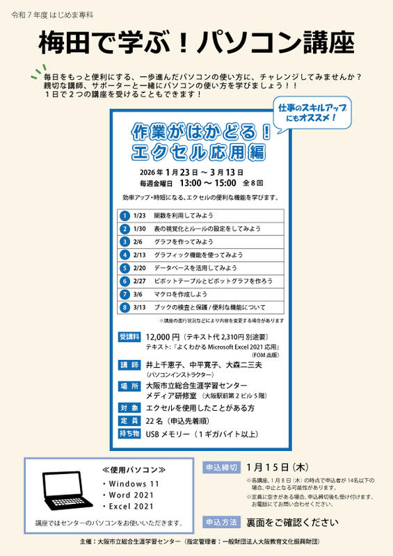 令和7年度はじめま専科 梅田で学ぶ! パソコン講座 エクセル応用編
