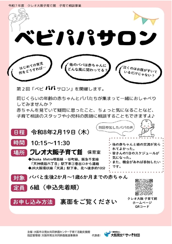 令和7年度 クレオ大阪子育て館 子育て相談事業として、第2回「ベビパパサロン」を開催します。はじめての育児で何をどうすればいいのか、他のパパは赤ちゃんにどんな風に関わっているのか、泣くのはお腹がすいているだけじゃないのかなど、同じくらいの年齢の赤ちゃんとパパたちが集まって一緒におしゃべりしませんか? 子育て相談のスタッフや小児科の医師に相談することもできます。対象はパパと生後2か月~1歳6か月までの赤ちゃんで、定員は6組(申込先着順)です。お申し込み方法は裏面をご覧ください。