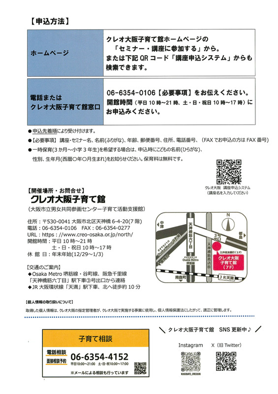 取得した個人情報は、クレオ大阪の指定管理者が、クレオ大阪で実施する事業に使用し、個人情報保護法にしたがって、適正に管理します。