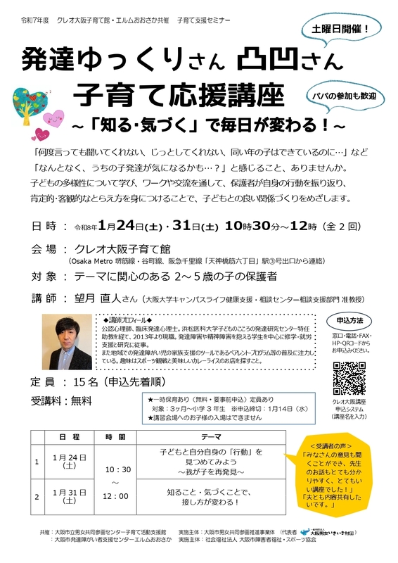 クレオ大阪子育て館 エルムおおさか共催 子育て支援セミナー発達ゆっくりさん 凸凹さん 子育て応援講座~ 「知る・気づく」で毎日が変わる! ~