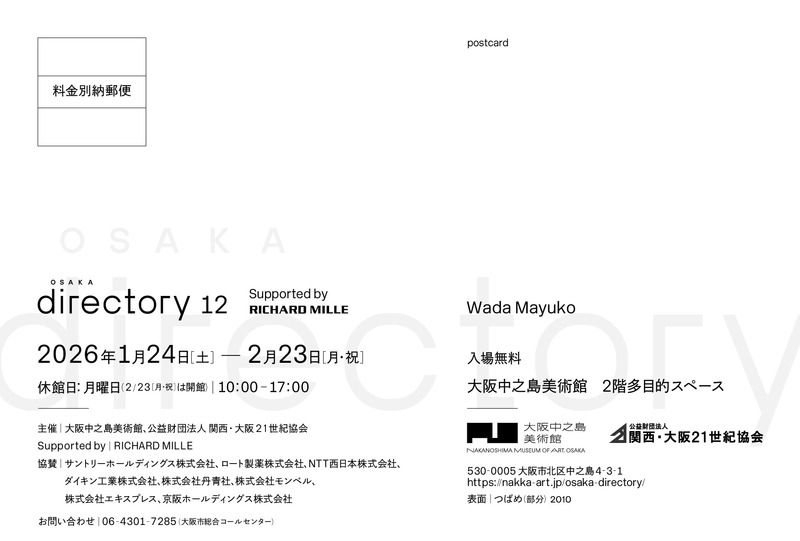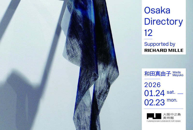 大阪中之島美術館で開催される「Osaka Directory 12」展覧会。開催期間は2026年1月24日から2月23日まで。休館日は月曜日ですが、2月23日(月・祝)は開館します。開館時間は10:00から17:00までです。入場は無料です。主催は大阪中之島美術館と公益財団法人関西・大阪21世紀協会。協賛企業にはサントリーホールディングス株式会社、ロート製薬株式会社、NTT西日本株式会社、ダイキン工業株式会社、株式会社丹青社、株式会社モンベル、株式会社エキスプレス、京阪ホールディングス株式会社が名を連ねています。