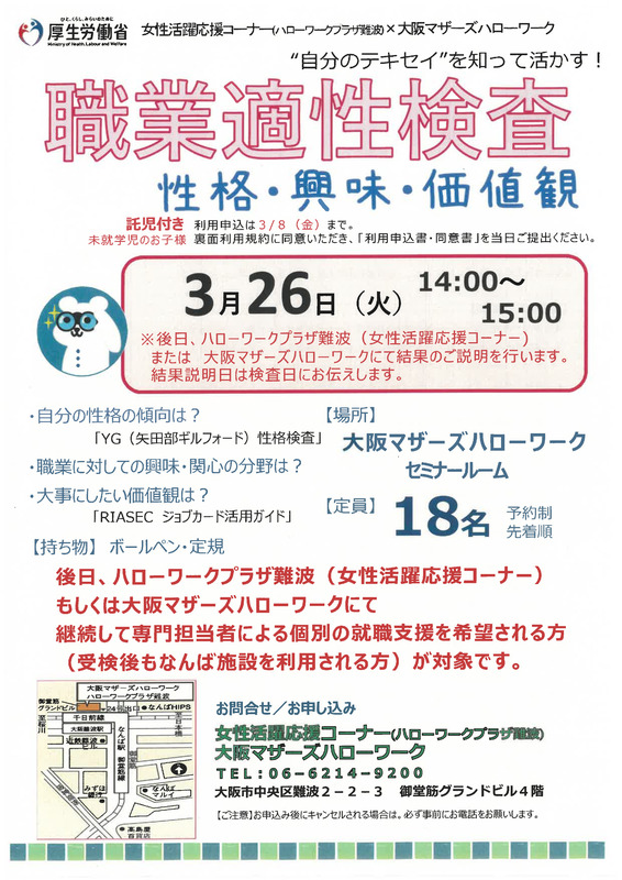 厚生労働省 女性活躍応援コーナー(ハローワークブラザ難波)× 大阪マザーズハローワークが主催する職業適性検査。自分の性格の傾向、職業に対しての興味・関心の分野、大事にしたい価値観を知ることができます。託児付きで、利用申込は3/8(金)まで。未就学児のお子様の託児も可能です。結果説明日は検査日にお伝えします。