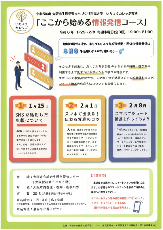 令和6年 1/25~2/8 毎週木曜日 (全3回) 19:00~21:00に開催される「ここから始める情報発信コース」では、SNSを活用した広報、スマホで出来る写真のコツ、スマホでショート動画を作る方法などを学ぶことができます。対象は大阪市内在住・在勤・在学の方で、定員は30名です。申込締切は1月10日 (水) 必着です。