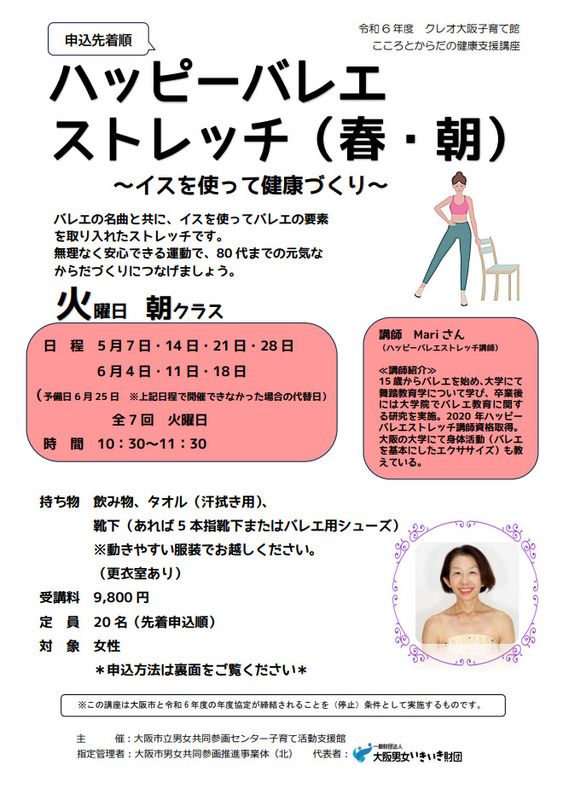 クレオ大阪子育てでは、「こころとからだの健康支援講座」としてハッピーバレエストレッチ講座を開催します。バレエの名曲と共に、イスを使ってバレエの要素を取り入れたストレッチを行います。無理なく安心できる運動で、80代までの元気なからだづくりにつなげましょう。