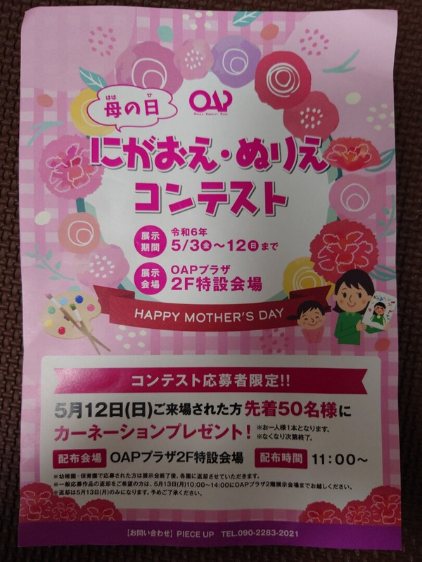 母の日を祝う「にがおえ・ぬりえコンテスト」の展示が令和6年5月3日から12日までOAPプラザの2F特設会場で開催されます。 5月12日には、先着50名の来場者にカーネーションをプレゼントします。プレゼントは1人1本限りで、なくなり次第終了となります。