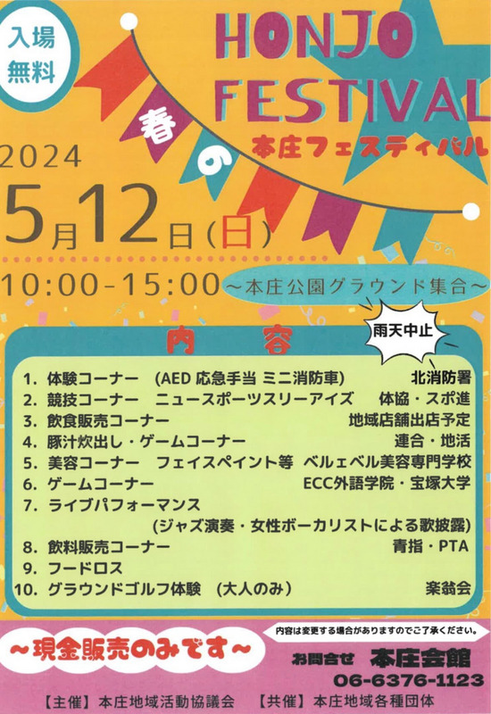 本庄フェスティバルは、2024年5月12日(日)に本庄公園グラウンドで開催されます。時間は10:00から15:00までで、雨天中止です。