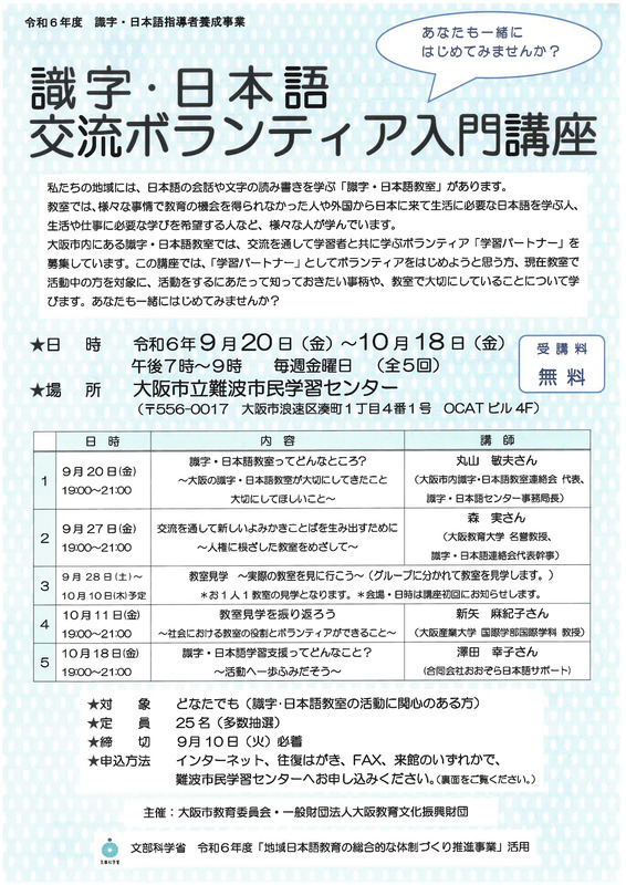 ◆FAX◆ 講座名「識字・日本語交流ボランティア入門講座」、お名前(ふりがな)、ご住所、電話番号(FAXでお申し込みの場合はFAX番号も必ず)、受講動機をご記入の上、大阪市立難波市民学習センターまで。