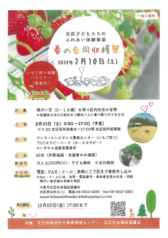 障がい児(2~18歳)を持つ区内在住の世帯を対象としたいちご狩り体験バスツアーです。保護者の方の介助付きで観光バスに乗り降りができる方が対象です。9:20に北区役所前集合、17:00頃に北区役所前解散です。行先はヤンマーシンピオシス栗東センター(いちご狩り)とTCCセラピーパーク(ホースセラピー)です。定員は45名で、多数の場合は抽選となります。参加費は大人2,000円で、子どもは無料です。申込締切は12月22日(金) 17:30までです。