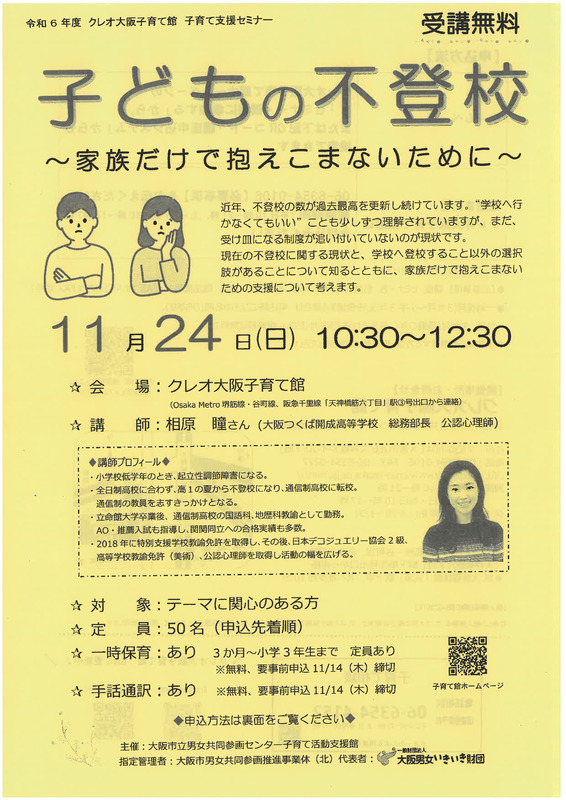 令和6年度 クレオ大阪子育て館 子育て支援セミナー 子どもの不登校