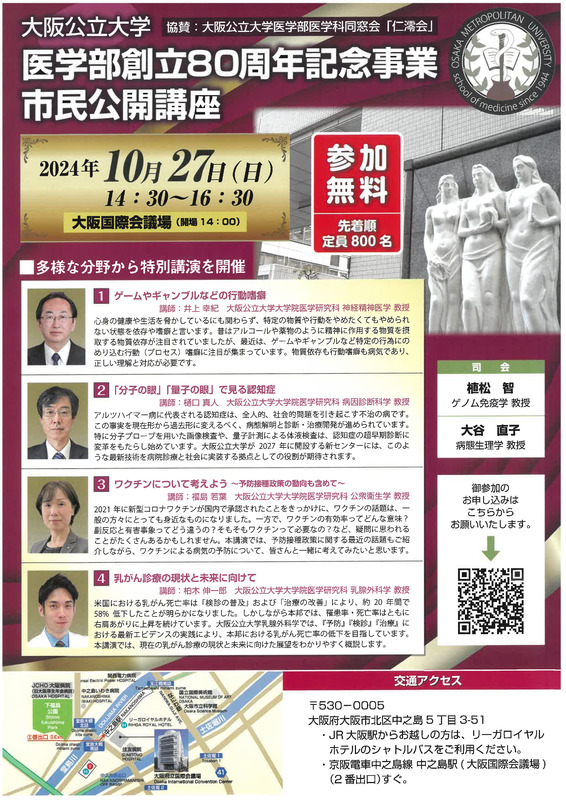 大阪公立大学医学部創立80周年を記念して、市民公開講座を開催します。参加は無料で、先着順で定員は800名です。多様な分野から特別講演を行います。