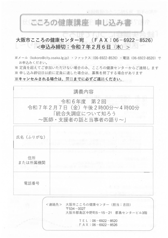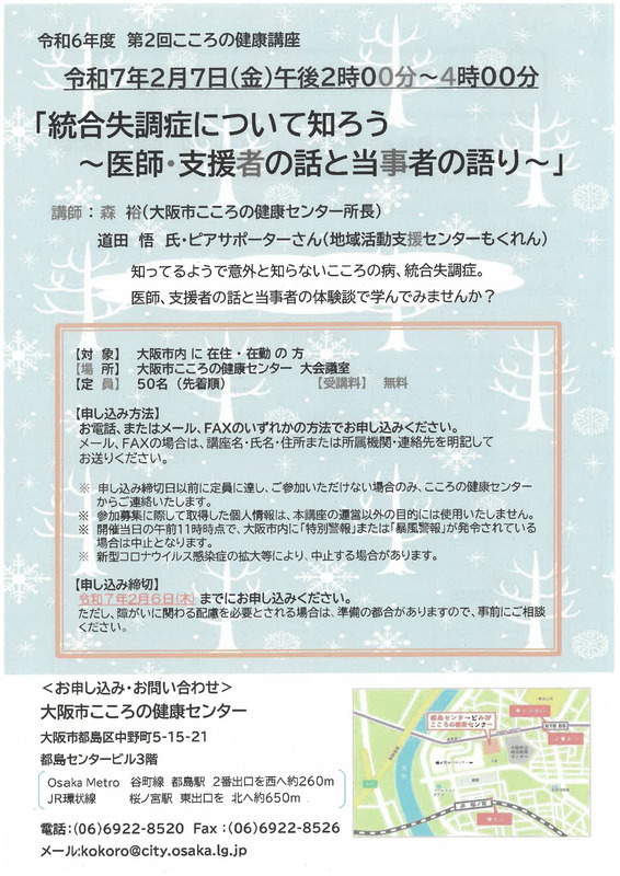 令和6年度 第2回こころの健康講座を開催します。テーマは「統合失調症について知ろう ~医師・支援者の話と当事者の語り~」です。講師は森 裕氏(大阪市こころの健康センター所長)、道田 悟氏、ピアサポーターさん(地域活動支援センターもくれん)です。大阪市内に在住・在勤の方が対象で、定員は50名(先着順)です。受講料は無料です。申し込みは電話、メール、FAXで受け付けています。申し込み締切は令和7年2月6日(木)です。特別警報や暴風警報が発令された場合や新型コロナウイルス感染症の拡大により中止する場合があります。