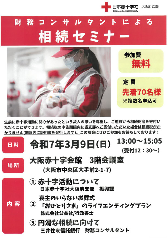 日本赤十字社大阪府支部が主催する相続セミナーです。参加費は無料で、定員は先着70名様です。セミナーでは、赤十字活動について、喪主のいらないお葬式、「おひとりさま」のライフエンディングプラン、円滑な相続に向けての内容が含まれます。三井住友信託銀行の財務コンサルタントによる相続無料相談会も同日開催されます。相談会はセミナー参加者のみが対象で、定員は先着2組です。