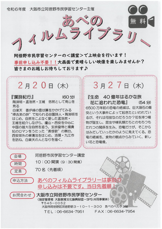 令和6年度 大阪市立阿倍野市民学習センター主催のあべのフィルムライブラリで、『漢詩紀行』の上映会を行います。陶淵明、孟浩然、王維を紹介しながら、中国の雄大な自然を追う内容です。事前申し込み不要で、当日先着順でご参加いただけます。定員は70名です。上映時間は60分です。