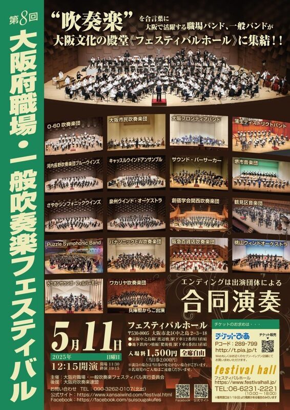 第8回 “吹奏楽” を合言葉に、大阪で活躍する職場バンド、一般バンドが大阪文化の殿堂《フェスティバルホール》に集結します。参加団体には、大阪市民吹奏楽団、大阪フロンティアバンド、0-60 吹奏楽団、ディストリクトバンド、河内長野吹奏楽団ブルーウインズ、キャッスルウインドアンサンブル、サウンドバーサーカー、堺市音楽団、さやかシンフォニックウインズ、泉州ウインドオーケストラ、Puzzle Symphonic Band、創価学会関西吹奏楽団、鶴見区音楽団、パナソニック EW吹奏楽団、阪急百貨店吹奏楽団、桃山ウィンドオーケストラ、ラニオンサウンズ・フィルハーモー、ワカリヤ吹奏楽団が含まれます。エンディングは出演団体による合同演奏です。入場料は1,500円(当日券2,000円)で、全席自由です。満員の場合は当日券の発売がない場合がございます。乳幼児のご入場はご遠慮ください。