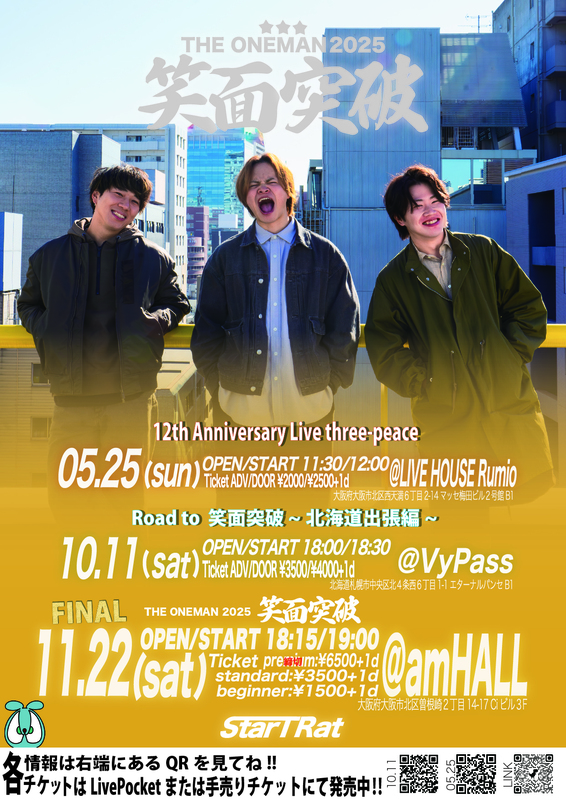 FINAL THE ONEMAN 2025 笑面突破が開催されます。開場は18:15、開演は19:00です。チケットはプレミアム6500円、スタンダード3500円、ビギナー1500円+1ドリンクです。情報は右端にあるQRを見てね!! 白チケットはLivePocketまたは手売りチケットにて発売中!!