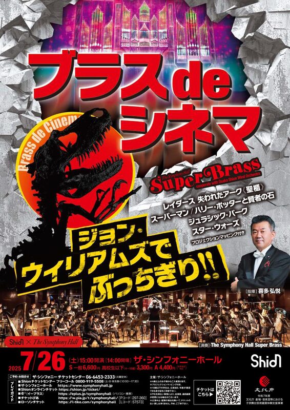 The Symphony Hall SuperBrassが大阪市音楽団と協力し、ジョン・ウィリアムズの名作をプロジェクションマッピング付きで演奏します。演目には『レイダース 失われたアーク《聖櫃》』、『スーパーマン』、『ハリー・ポッターと賢者の石』、『ジュラシック・パーク』、『スター・ウォーズ』が含まれます。指揮は喜多弘悦が務めます。開演は15:00、開場は14:00です。チケットは一般6,600円、高校生以下3,300円、A席4,400円(税込)です。4歳以上のお子様からご入場いただけます。18歳以下の学生は公演当日に年齢が確認できる身分証をご持参ください。出演者や曲目が変更になる場合がありますが、公演中止・延期の場合を除いて、チケットの払い戻しは承りません。