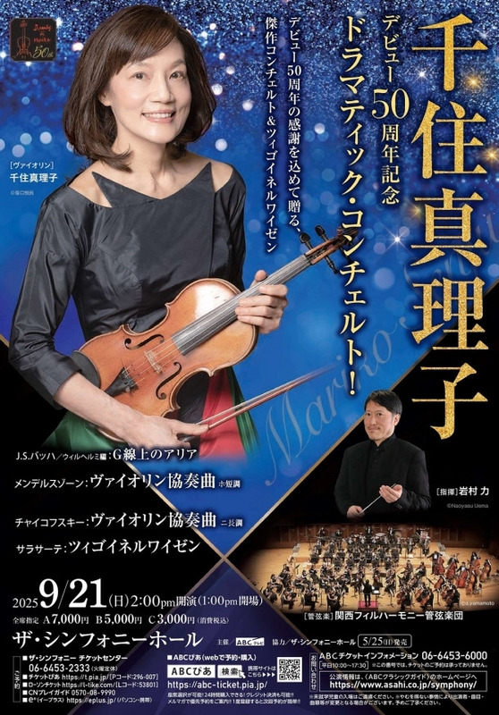 千住真理子デビュー50周年を記念して、ドラマティック・コンチェルトが開催されます。プログラムには、J.S.バッハ/ウィルヘルミ編: G線上のアリア、メンデルスゾーン:ヴァイオリン協奏曲 ホ短調、チャイコフスキー:ヴァイオリン協奏曲 ニ長調、サラサーテ ツィゴイネルワイゼンが含まれています。関西フィルハーモニー管弦楽団が演奏を担当します。全席指定で、A席7,000円、B席5,000円、3,000円(消費税込)です。未就学児童の入場はご遠慮ください。やむを得ない事情により、曲目等が変更となる場合がございます。予めご了承ください。