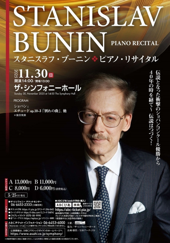 スタニスラフ・ブーニンによるピアノ・リサイタルが開催されます。プログラムにはショパンのエチュード op.10-3 「別れの曲」他が予定されています。チケットはA席13,000円、B席11,000円、C席8,000円、D席6,000円(税込)で、5月25日(日)に発売されます。学児童の入場はご遠慮ください。止むを得ない事情により内容は変更となる場合があります。