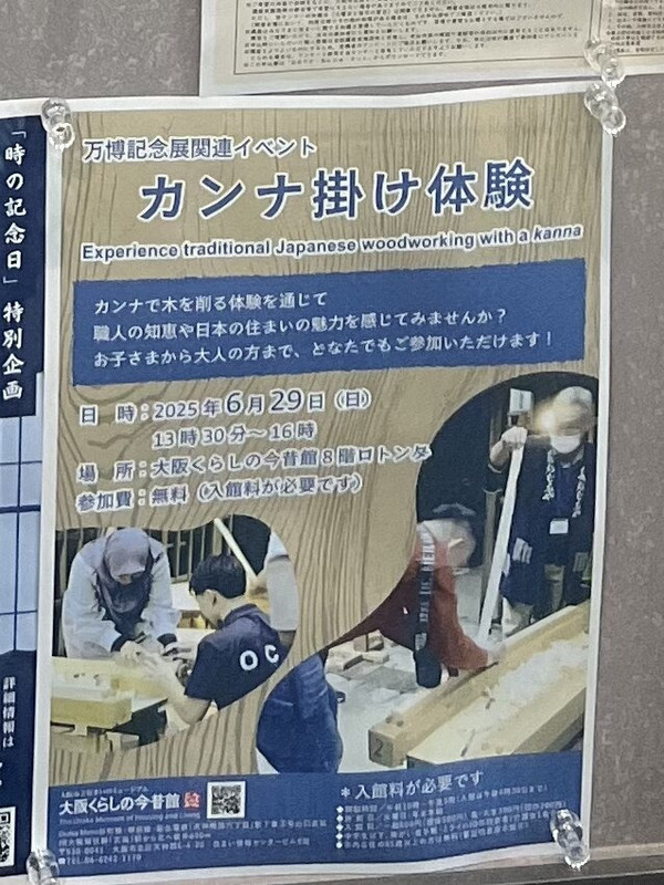 万博記念展関連イベントとして、カンナ掛け体験を開催します。カンナで木を削る体験を通じて、職人の知恵や日本の住まいの魅力を感じてみませんか? お子さまから大人の方まで、どなたでもご参加いただけます! 参加費は無料ですが、入館料が必要です。