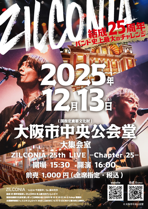 ZILCONIAの結成25周年を記念した史上最大のチャレンジ。文化財を貸し切っての単独公演です。開場は15:30、開演は16:00です。前売りチケットは1,000円(全席指定・税込)です。
