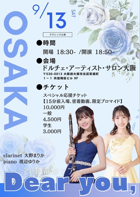 クラシック公演が開催されます。開場は18:30、開演は18:50です。出演者はクラリネットの大野まりかさんとピアノの渡辺ゆりかさんです。全国5都市ツアーの一環として行われます。チケットはスペシャル応援チケット(15分前入場、密着動画、限定ブロマイド)10,000円、一般4,500円、学生3,000円です。