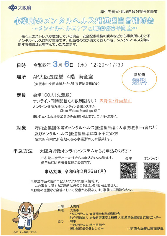 働く人のストレスが増加している現在、安全配慮義務の観点などから事業所におけるメンタルヘルス対策が重要です。担当者の方が備えておくべき、メンタルヘルス対策に関する知識などを学んでいただきます。オンライン同時配信もありますが、録音・録画は禁止です。レジュメは会場参加者のみ配布いたします。申込方法は大阪府行政オンラインシステムからお申込みください。申込期限は令和6年2月26日です。対象は府内企業団体等のメンタルヘルス推進担当者(人事労務担当者など)及びメンタルヘルス推進担当者になる予定の方です。