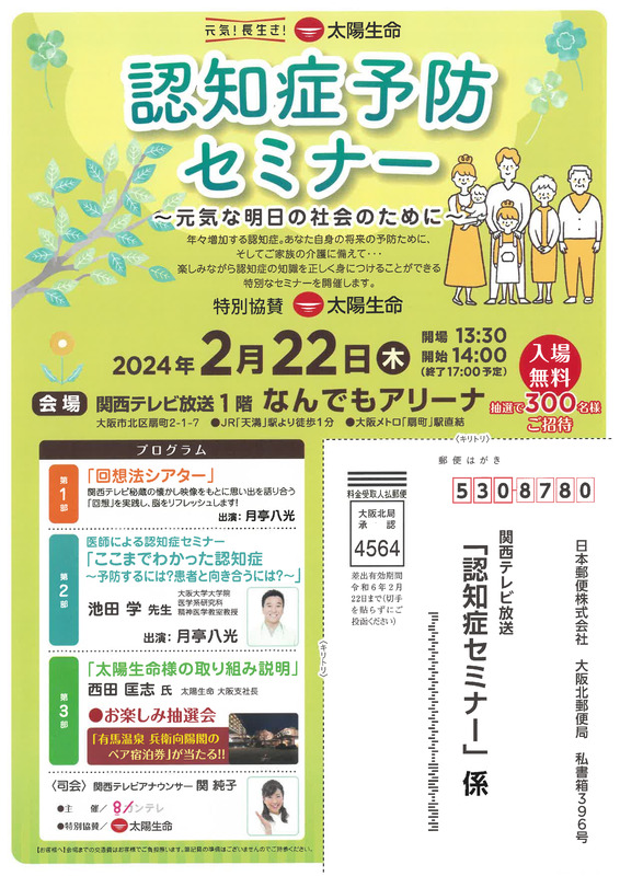 年々増加する認知症。 あなた自身の将来の予防ために、そしてご家族の介護に備えて・・・楽しみながら認知症の知識を正しく身につけることができる特別なセミナーを開催します。プログラムには、「回想法シアター」、医師による認知症セミナー「ここまでわかった認知症 ~予防するには? 患者と向き合うには?〜」、太陽生命様の取り組み説明、お楽しみ抽選会が含まれます。出演者は月亭八光、池田学先生(大阪大学大学院医学系研究科精神医学教室教授)、西田匡志氏(太陽生命 大阪支社長)です。