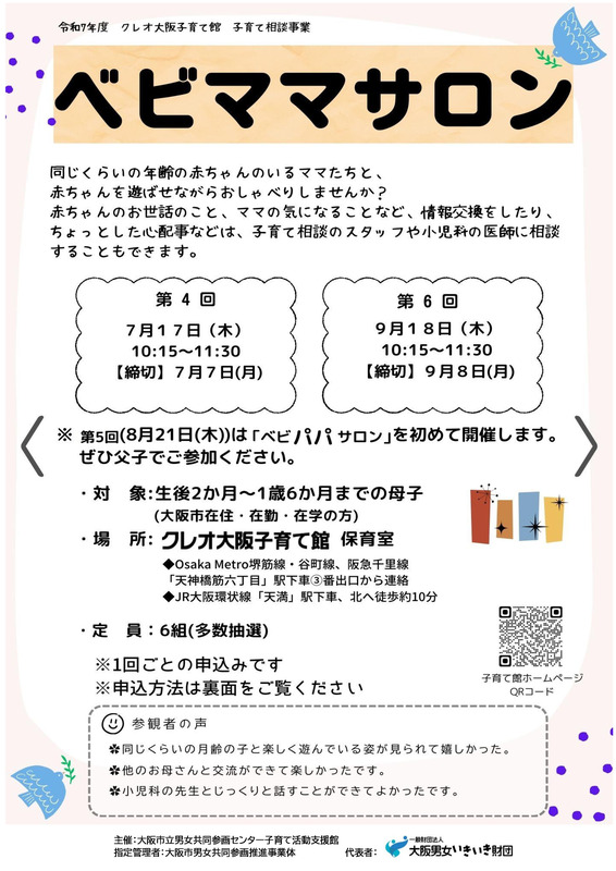 同じくらいの年齢の赤ちゃんのいるママたちと、赤ちゃんを遊ばせながらおしゃべりしませんか? 赤ちゃんのお世話のこと、ママの気になることなど、情報交換をしたり、ちょっとした心配事などは、子育て相談のスタッフや小児科の医師に相談することもできます。対象は生後2か月~1歳6か月までの母子(大阪市在住・在勤・在学の方)。定員は6組(多数抽選)。申込締切は9月8日(月)。