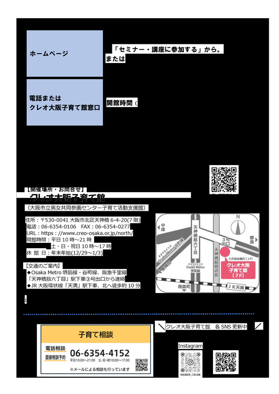 クレオ大阪子育て館 (大阪市立男女共同参画センター子育て活動支援館) 住所:〒530-0041 大阪市北区天神橋6-4-20(7階) 06-6354-0106 FAX: 06-6354-0277 URL: