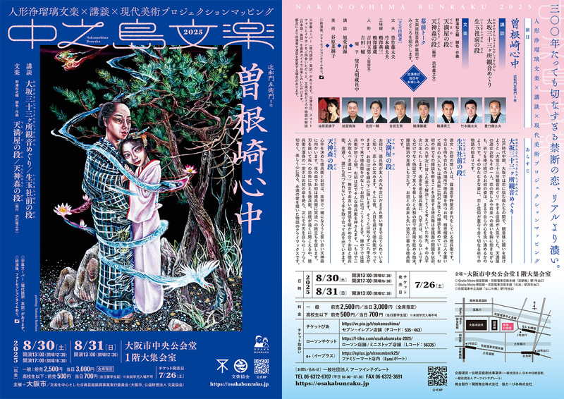 三〇〇年たっても切なすぎる禁断の恋、リアルより濃厚な物語をお届けします。瑠璃文楽と講談、現代美術プロジェクションマッピングの融合による公演です。演目は近松門左衛門作の『曾根崎心中』。出演者には竹本織太夫、豊竹藤太夫、鶴澤燕三、吉田玉男(人間国宝)などが名を連ねます。終演後にはフォトセッションタイムもあります。字幕スーパー(現代語訳・英訳)もご用意しておりますので、スマートフォンとイヤホンをご持参ください。