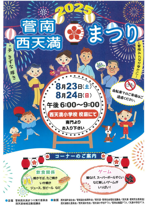 後援: 西天満町連合会、菅南連合振興町会、西天満・菅南社会福祉協議会、西天満・菅南民生委員協議、西天満地域活動協議会、西天満教化委員会、西天満女性会、西天満小学校PTA、菅南幼稚園PTA、天満中学校PTA