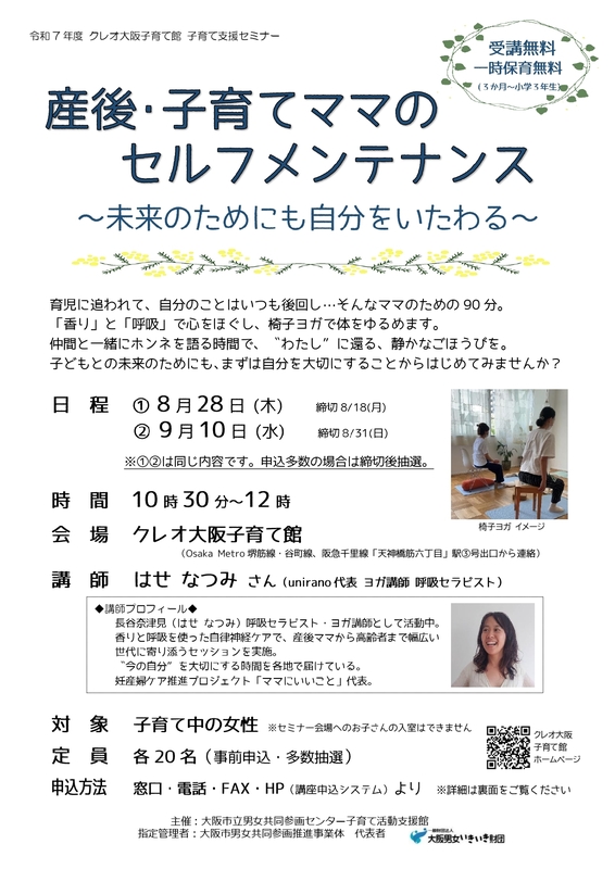 令和7年度 クレオ大阪子育て館 子育て支援セミナー 産後・子育てママのためのセルフメンテナンスセミナー