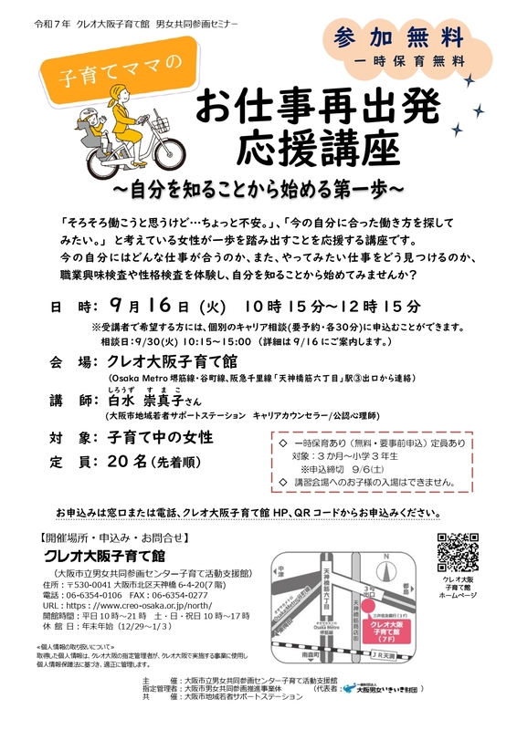 子育てママの参加無料、一時保育無料のお仕事再出発応援講座です。自分を知ることから始める第一歩として、職業興味検査や性格検査を体験し、今の自分に合った働き方を探すことを応援します。講師は白水崇真子さん(大阪市地域若者サポートステーション キャリアカウンセラー/公認心理師)。対象は子育て中の女性で、定員は20名(先着順)。一時保育あり(無料・要事前申込、定員あり)。申込締切は9月6日(土)。9月16日の講座受講者で希望する方には、個別のキャリア相談(要予約・各30分)に申込むことができます。詳細は9月16日にご案内します。