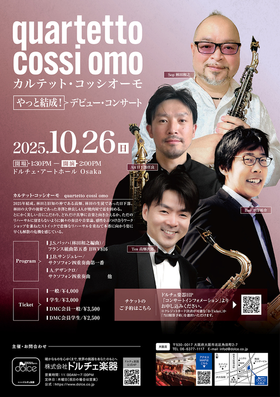 カルテット・コッシオーモのデビューコンサートが開催されます。メンバーはSop 林田和之、Alt 日下部任良、Ten 高畑次郎、Bar 井澤裕介。プログラムにはJ.S.バッハのフランス組曲第五番 BWV816(林田和之編曲)、J.B.サンジュレーのサクソフォン四重奏曲第一番、A.デザンクロのサクソフォン四重奏曲などが含まれています。一般チケットは4,000円、学生チケットは3,000円、IDMC会員は割引があります。チケットの予約はドルチェ楽器の公式HPから可能です。
