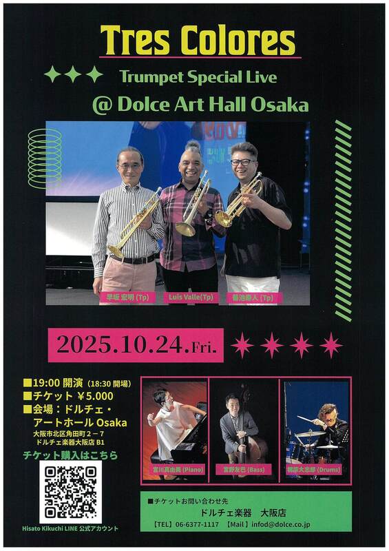 Tres Colores Trumpet Special Liveがドルチェ・アートホール Osakaで開催されます。出演者は早坂宏明 (Tp)、Luis Valle(Tp)、菊池 (Tp)、宮川真由美 (Piano)、宮野友巴(Bass)、梶原大志郎 (Drums)です。開演は19:00で、開場は18:30です。チケットは¥5,000で、ドルチェ楽器大阪店 B1で購入できます。