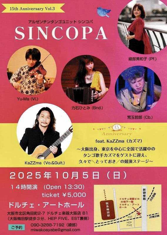 アルゼンチンタンゴユニットシンコパによる15周年記念公演Vol.3。ゲストに大阪出身で東京を中心に全国で活躍中のタンゴ歌手カズマを迎え、久々でとっておきの競演ステージをお届けします。開演は14時、開場は13時30分です。チケットは5,000円です。