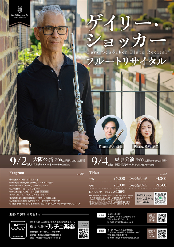 ゲイリー・ショッカーによるフルートリサイタルが開催されます。フルートは清水信貴、ピアノは桑島芙美が担当します。プログラムにはスケルツォ、フランスの音楽、アンダーワールド、エアボーン、木版画(本邦初演)、エレヴ・シャロム、後悔と決心、アンビデックストラナータ、2本のフルートのための3つのダンスが含まれています。チケットは一般5,000円、DMC会員一般4,500円、学生4,000円、DMC会員学生3,500円です。D-Ticketを利用すると上記金額から300円引きとなります。