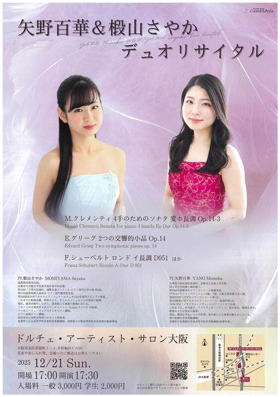 矢野百華と椴山さやかによるデュオリサイタルが開催されます。プログラムには、M.クレメンティの4手のためのソナタ 変ホ長調 Op.14-3、E.グリーグの2つの交響的小品 Op.14、F.シューベルトのロンドイ長調 D951などが含まれています。開場は17:00、開演は17:30です。入場料は一般3,000円、学生2,000円です。チケットはQRコードの読み取りまたは演奏会デザインカンタービレで検索してください。花束や差し入れ等、会場へのご郵送はお控えください。