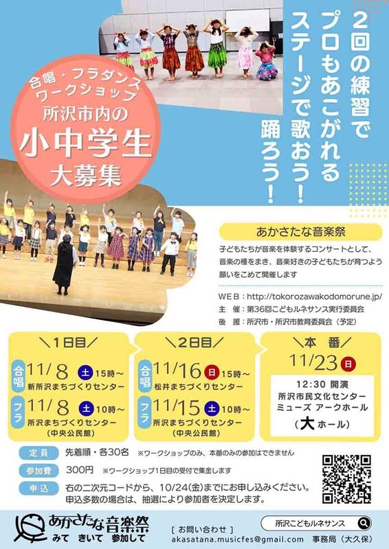 あかさたな音楽祭のワークショップが開催されます。所沢市内の小中学生を対象に、合唱とフラダンスのワークショップを行います。参加費は300円で、ワークショップ1日目の受付で集金します。定員は先着順で各30名です。ワークショップのみ、本番のみの参加はできません。 フラダンス:1日目 11/8(土)10:00~/2日目 11/15(土)10:00~