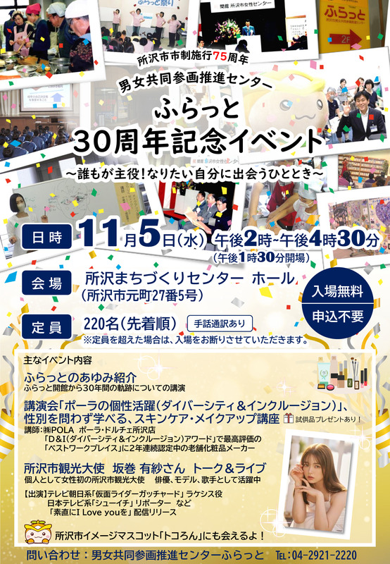 所沢市男女共同参画推進センターふらっとの30周年を記念して、様々なイベントが開催されます。主な内容として、ふらっとのあゆみ紹介、30年間の軌跡についての講演、ポーラの個性活躍に関する講演会、性別を問わず学べるスキンケア・メイクアップ講座(試供品プレゼントあり)などがあります。また、所沢市観光大使の坂巻有紗さんによるトーク&ライブも予定されています。所沢市イメージマスコット「トコろん」にも会えます。入場は無料で、申込不要です。定員は220名で、先着順となります。手話通訳もあります。