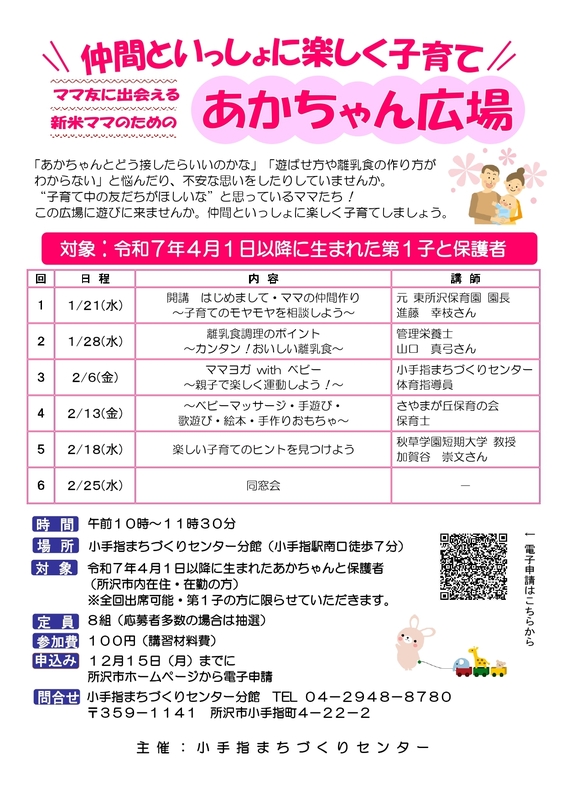新米ママのためのあかちゃん広場では、子育て中の友だちを作りたいママたちが集まり、楽しく子育てを学ぶことができます。対象は令和7年4月1日以降に生まれた第1子とその保護者です。講師による離乳食の作り方やママヨガ、ベビーマッサージなどのプログラムが用意されています。全6回のプログラムで、毎回異なる内容が提供されます。定員は8組で、応募者多数の場合は抽選となります。参加費は100円で、講習材料費が含まれます。参加希望の方は12月15日までに所沢市ホームページから電子申請を行ってください。