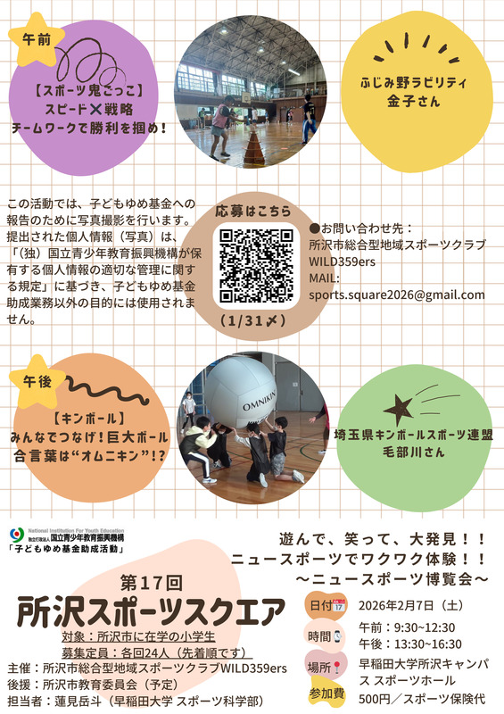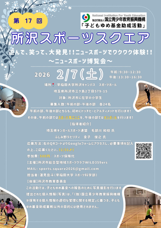 第17回ニュースポーツ博覧会が開催されます。午前の部・午後の部の2部制で、ドッヂビーとアルティメットを行い、その後スポーツ鬼ごっこを行います。対象は所沢市に在学の小学生で、募集人数は各部24名です。参加費は500円(スポーツ保険代)。応募はQRコードからGoogleフォームにアクセスし、必要事項を記入の上ご応募ください。写真撮影が行われ、個人情報は適切に管理されます。