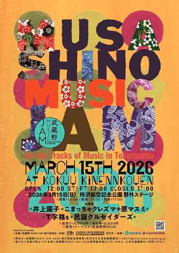 MUSASHIONO MUSIC JAMが2026年3月15日に所沢航空記念公園野外ステージで開催されます。開場は12:00、開演は13:00、終了は17:00です。出演者には井上園子、こまっちゃクレズマ+原マスミ、T字路s、民謡クルセイダーズが含まれます。前売りチケットは5,000円、当日券は6,000円です。チケットはイープラス音楽喫茶MOJOで販売されています。