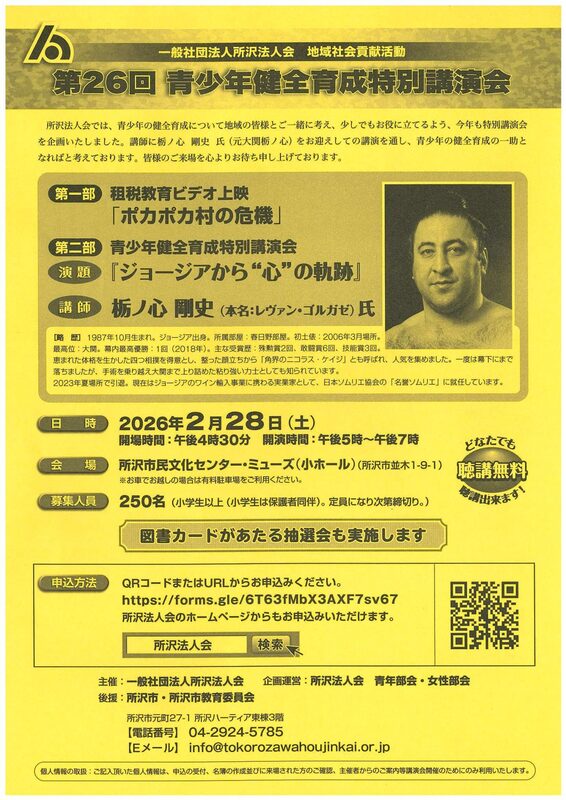 所沢法人会では、青少年の健全育成について地域の皆様とご一緒に考え、少しでもお役に立てるよう、今年も特別講演会を企画いたしました。講師に栃ノ心 剛史 氏(元大関栃ノ心)をお迎えしての講演を通し、青少年の健全育成の一助となればと考えております。第一部では租税教育ビデオ「ポカポカ村の危機」を上映し、第二部では栃ノ心 剛史氏による特別講演「ジョージアから“心” の軌跡」を行います。聴講無料で、図書カードがあたる抽選会も実施します。募集人員は250名で、小学生以上(小学生は保護者同伴)が対象です。定員になり次第締切りとなります。申込方法はQRコードまたはURLからお申込みください。