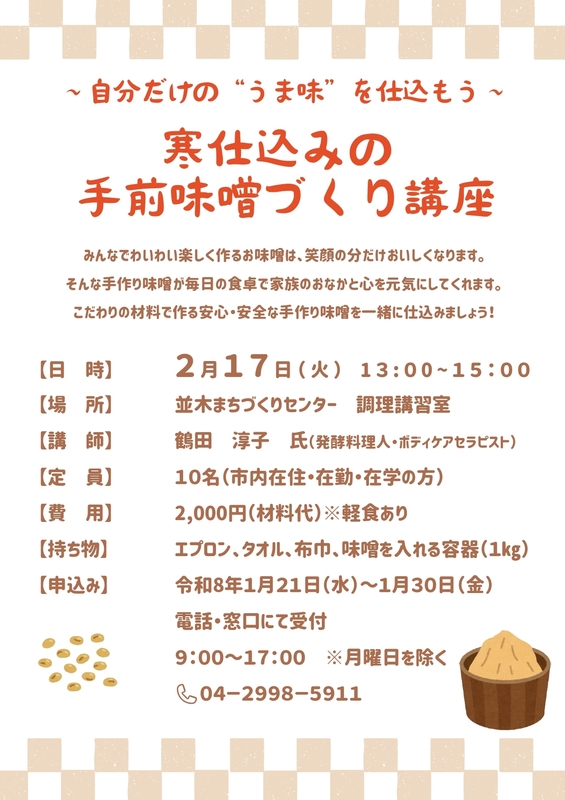 【持ち物】エプロン、タオル、布巾、味噌を入れる容器(1kg)