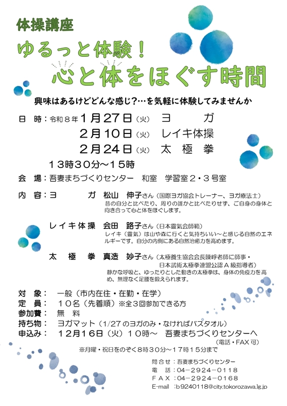 太極拳を体験してみませんか。真造妙子さん(太極養生協会会長陳岬老師に師事・日本武術太極拳連盟公認A級指導者)による指導で、静かな呼吸と、ゆったりとした動きの太極拳は、身体の免疫力を高め、無理なく足腰を鍛えられます。対象は市内在住・在勤・在学の一般の方で、定員は10名(先着順)です。全3回参加できる方が対象です。参加費は無料です。持ち物はヨガマット(1/27のヨガのみ・なければバスタオル)。申込みは12月16日(火)10時から吾妻まちづくりセンターへ(月曜・祝日をのぞく8時30分~17時15分まで、電話・FAX可)。