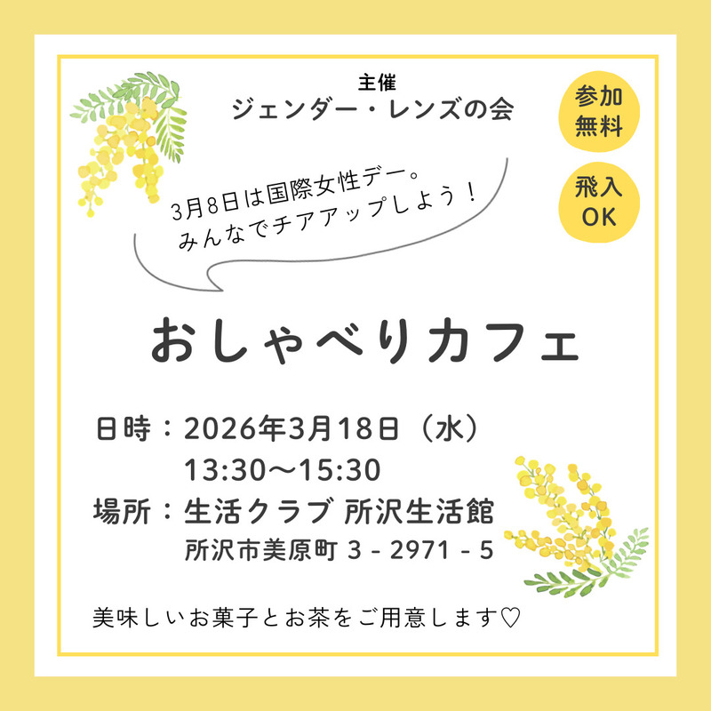 ジェンダー・レンズの会が主催するおしゃべりカフェに参加しませんか? 3月8日の国際女性デーをみんなでチアアップしましょう! 飛入OKで、美味しいお菓子とお茶をご用意しています。 参加は無料です。