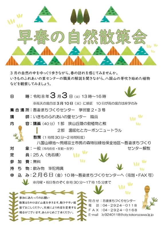 ・散策 (1時間30分~2時間程度) 八国山緑地~荒幡富士市民の森特別緑地保全地区~吾妻まちづくりセンター解散