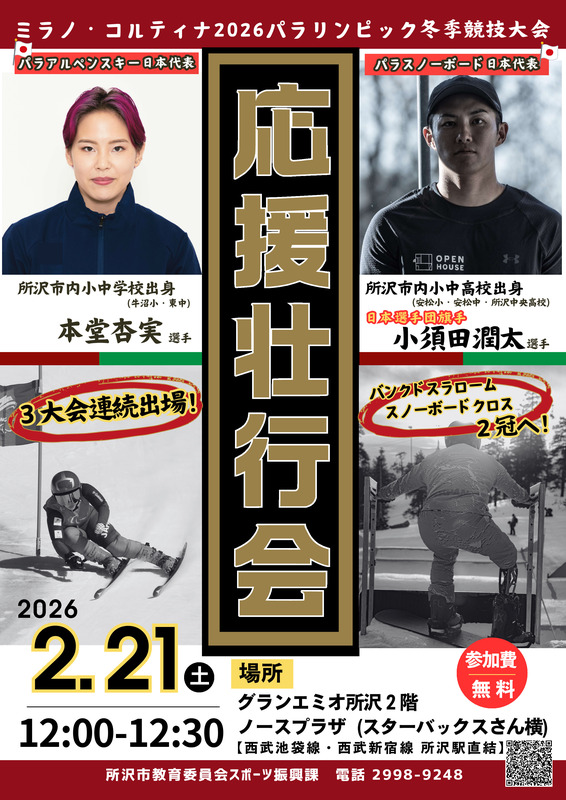ミラノ・コルティナ2026パラリンピック冬季競技大会に出場するパラアルペンスキーとパラスノーボードの日本代表選手を紹介します。所沢市内小中学校出身の本堂杏実選手(牛沼小・東中)と小須田潤太選手(安松小 安松中・所沢中央高校)が登場します。小須田選手は日本選手団旗手を務め、3大会連続出場を果たします。バンクドスラロームとスノーボードクロスで2冠を目指します。参加費は無料です。